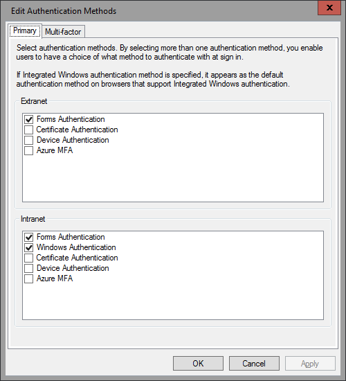 Lastly, note that the Azure MFA provider is NOT configured by default (you can quickly verify this via Get-AdfsAzureMfaConfigured). Unfortunately, there is no documentation available on that yet and the Set-AdfsAzureMfaTenant/New-AdfsAzureMfaTenantCertificate cmdlets don’t offer any examples as well. So I will get back to that once there is some more information available, but if you want to fake it for now, just use “Set-AdfsAzureMfaTenant -TenantId a” or whatever J