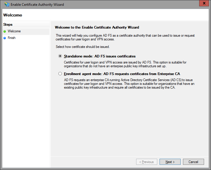 The next subnode allows you to configure the AD FS server as a certificate authority or connect it with an existing AD CA. With ease! All it takes is few clicks: