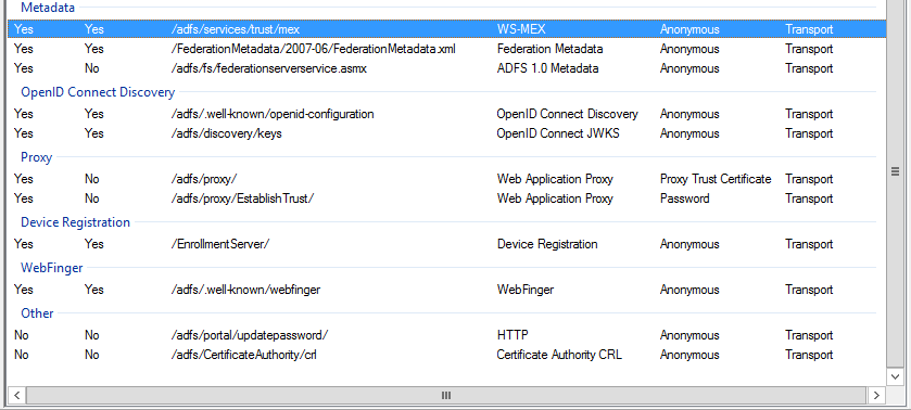 Device Registration configuration has also been simplified, but we have seen this one already in the previous TP version of Windows Server. The Endpoints configuration has not changed as well, but the number of endpoints has jumped to 59. They give you some hints of what is coming – OpenID, WAP proxy, WebFinger all built-in. Plus options to enable password change and CRL checks.