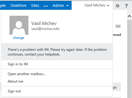 In the new OWA, this will result in a similar error message: “There’s a problem with IM. Please try again later. If the problem continues, contact your helpdesk.” Here’s also a screenshot: