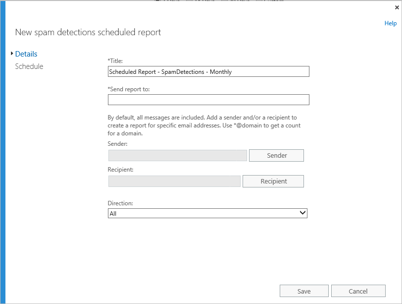 PS C:\> New-ReportSchedule -ScheduleName blabla -ReportType MailTraffic -ReportFrequency Weekly -NotificationEmail user@domain.com -Direction All -ExpiryDate "30 May 2015"