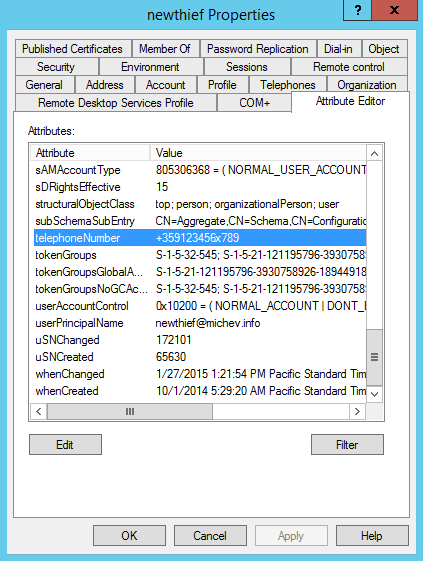 Well, the answer is quite simple: you can use the telephoneNumber AD attribute and append the extension to it using the format: +123456×789 where the fist part will be the actual phone number and the part after ‘x’ will be the extension. Here’s how it looks like in the ADUC console: