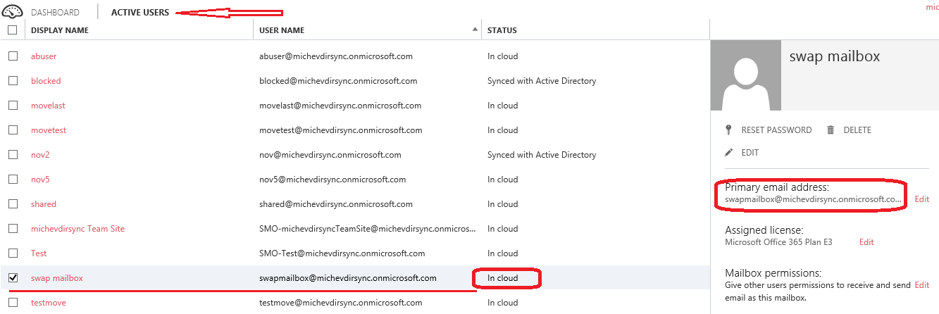 PS C:> Get-MsolUser -SearchString swap | fl UserPrincipalName,ObjectId,ImmutableId,LastDirSyncTime UserPrincipalName : swapmailbox@michevdirsync.onmicrosoft.com ObjectId : 151a4f28-fb9d-45ef-95bf-b3a7cccfeb2f ImmutableId : 1KlUci/w70u0mOz242tEPw== LastDirSyncTime : 01/10/2014 11:42:05 PS C:> Get-Mailbox swapmailbox | fl *guid* ExchangeGuid : 96658711-bdb8-4b78-a907-12f0e5cb60ca Guid : 6290c800-2879-4d99-8bd1-acb3ffe36d44