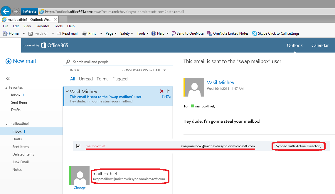 If you compare those with the values at the beginning, you will see that this is indeed the same mailbox. The WAAD user object linked to it is also the same (note the ObjectId parameter). That object however is now linked to a different object in my local AD, thus the ‘mailboxthief’ has claimed ownership of the ‘swapmailbox’.