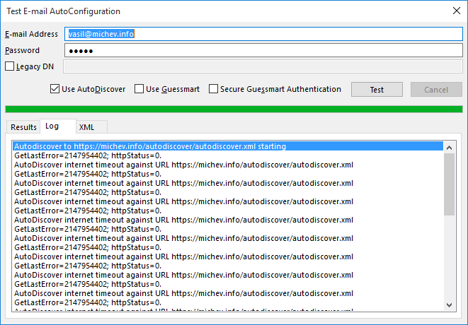 This is caused by some bug (or leftover debug code) that forces Outlook to try a little too hard to obtain a response from the Autodiscover directory on your root domain. If the domain resolves in DNS but does not respond to HTTP queries (i.e. you don’t have an actual server to acknowledge them), this will cause timeout error, and Outlook will try again and again and again. Here’s how it looks like: