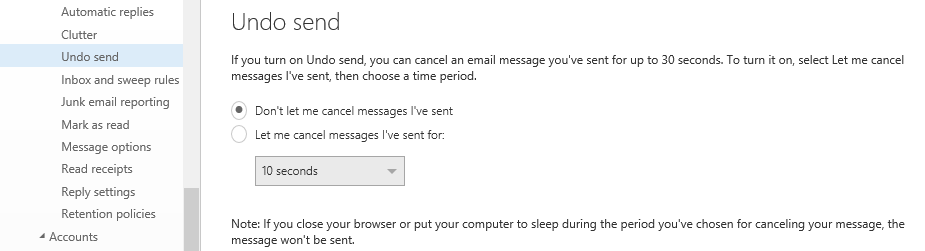 - Under the Mail section, Automatic processing, we have the new Undo send options. It’s another example of a feature “borrowed” from Gmail, and it works by delaying your messages by up to 30 seconds. The options you can configure for said feature are shown below: