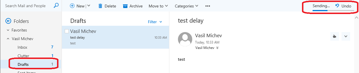 Once you toggle the feature, any new messages you compose in OWA will be kept into the Drafts folder for the specified number of seconds after you press the Send button. A visual indicator for the remaining time will be shown on the top right corner, along with an Undo button: