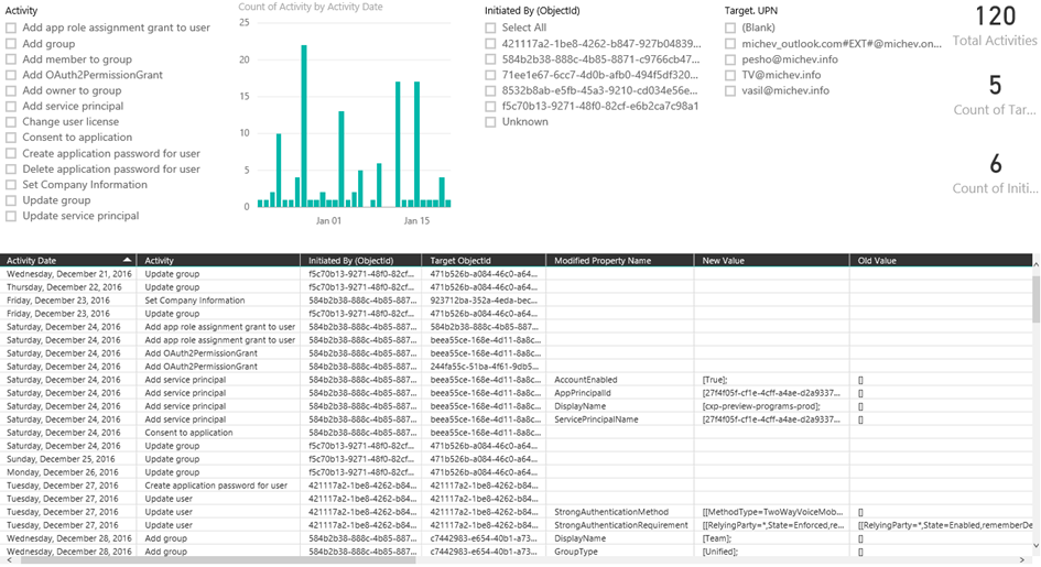 As before, it’s easy to add slicers by date or activity type. Determining who performed the action and which object(s) were modified is a bit trickier however, as the relevant data is not always presented in a readable form in the dataset. One can of course rely on the ObjectId, however linking it to actual user/application/service name in the web UI is not possible. Instead, you would have to use the full data modeling experience available in PowerBI Desktop.