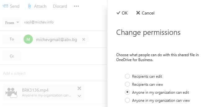 Note the absence of the two “Anyone” checkboxes. In addition, the default permission level is now set to “anyone in my organization”. Switching the Sharing settings back will once again make the “Anyone” option available. Exchange Online will query those setting on the backend asynchronously, so you don’t even have to close the message window to have them reflected (although you have to re-attach the file).