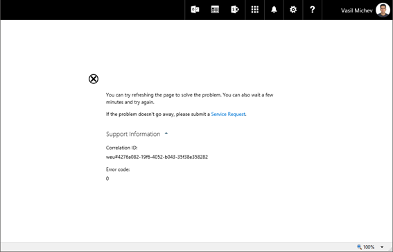 Of course, at times there are issues that affect the actual SHD or the admin section of the Office 365 or even Office 365 login entirely. For example, last week a service interruption event (MO107347) prevented customers from using the Office 365 admin center to open service requests. As another example, earlier this morning (July 3rd) parts of EMEA were affected by an issue with the authentication infrastructure, which prevented users from accessing the Office 365 portal. A logon loop was experienced for new logins, while users that were already logged in to the service were greeted with the following error when trying to access the Admin portal: