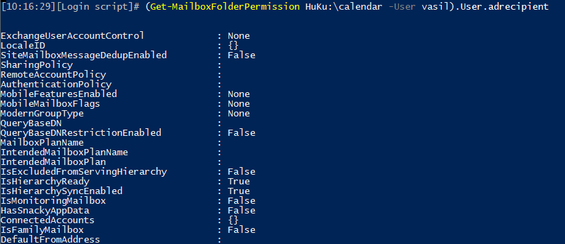 The difference here is that data for vasil’s user will be returned, so you can enter anything for the –User part. Well, any user that actually has a matching permission entry on the mailbox. If nothing else, you can use the ” NT AUTHORITY\SELF” principal. Or you can run it without the –User parameter, however you will get duplicate output for each entry, and that’s a lot of data. 505 properties at the time of writing to be more precise, for the corresponding Deserialized.Microsoft.Exchange.Data.Directory.Recipient.ADUser object returned. So you can still get properties such as DelegateListLink or RecipientDisplayType. Have fun.