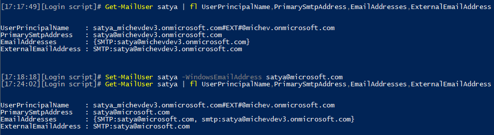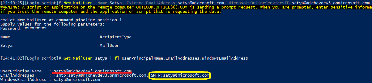 And therein lies the issue. While a mail user or a guest user has to login with the corresponding UPN in order to participate in Teams activities, any conversations he is part of are being stored using his Primary SMTP Address as the identifier. It’s much easier to understand the problem when an example is given, so let’s assume that some naughty person in my tenant decided to abuse this and created a mail user with satya@microsoft.com as the email address. The below example illustrates how easy is to create such mail user: