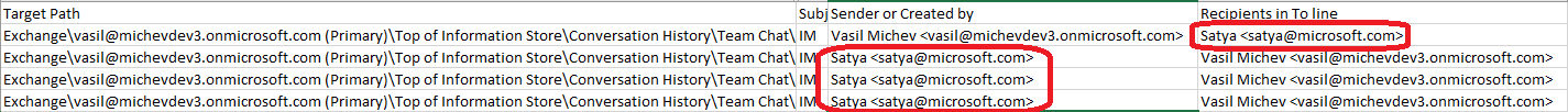 As mentioned above, in this simple example it’s easy enough to notice the discrepancy in user’s information, even without looking into the contact card. However, the topic at hand here is compliance, so let’s see what happens once an eDiscovery officer stumbles into the above example. Let’s assume a query has been run to return all Teams chats for my user (“Vasil” in the above example). This is what the legal officer will actually see: