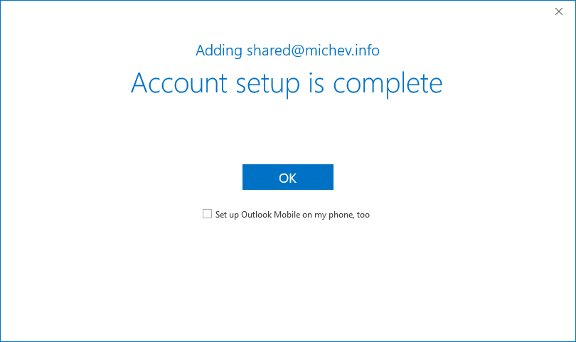If everything goes OK with the authentication process, Outlook will be able to fetch the configuration file for the shared mailbox and you will be presented with the following screen: