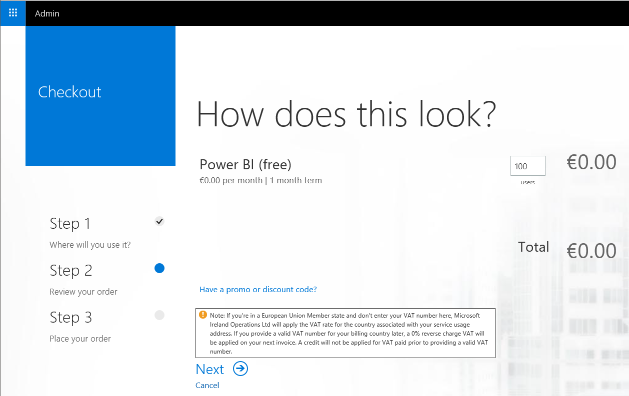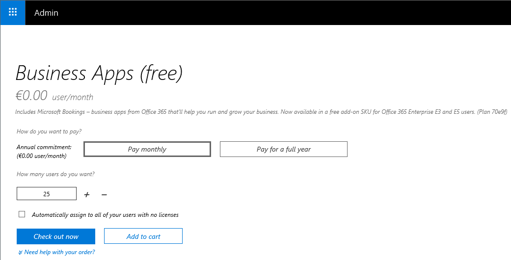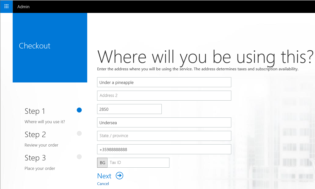 In case you have missed it, Microsoft has rolled out a refresh of the “purchase services” UI found in the Office 365 Admin center under the Billing menu. One you navigate to the page and select the service to buy or try, you will be presented with the following page: