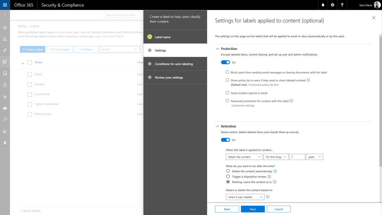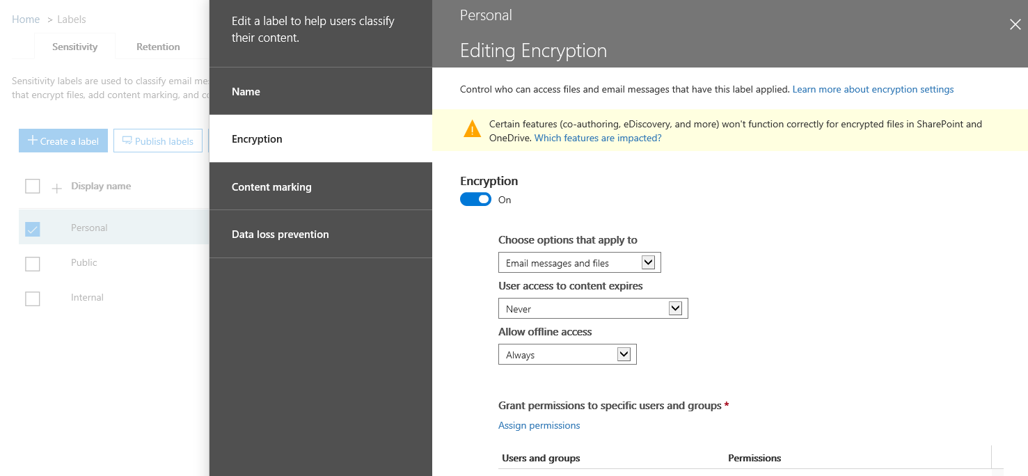 So, forget about having single “unified label” that can be used to classify an item, add visual elements to it, set retention period and action, protect it via RMS encryption, trigger DLP controls whenever it’s shared, and so on. You will still be able do all of these, and more, but simply not via the same “apply a single label” concept. Instead, we will have separate “Retention” and “Sensitivity” labels, and the focus seems to now have shifted to an “unified platform” powering those. Which can again be considered misleading, given the split between Security, and Compliance, which will both get their own portals soon.