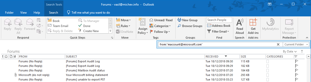 Short and quick – it seems that at least some of the Billing notification emails that Microsoft is sending to Office 365 customers now come from a new email address, namely maccount@microsoft.com.