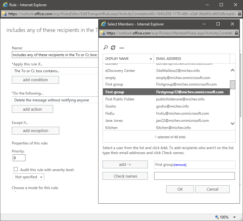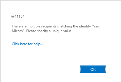 The issue is evident when you create a new mail flow rule, or edit an existing one. All you need to do is include any condition, exception or action that involves some kind of recipient to be designated. It seems that some changes were made recently to the UI, which now passes the Display Name attribute to the underlying PowerShell engine. And since for every tenant with more than a handful of users it’s expected to have at least few objects with matching Display Names, selecting one such object results in the following error message: