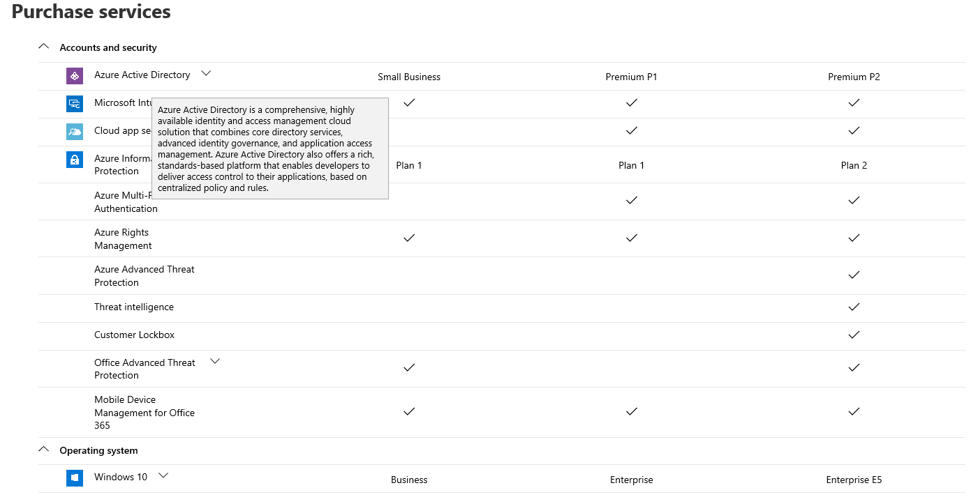 At a glance, you can compare the mailbox storage limits across plans, as well as other features such as Archiving and anti-malware protection. Similarly, for SharePoint you will have some workload-specific details, such as cross-site publishing or the app catalog. In addition, you can hover over any of the entries and get more information about specific feature, illustrated below for the Azure AD entry (which has a tons of individual items underneath, and it’s well worth exploring):