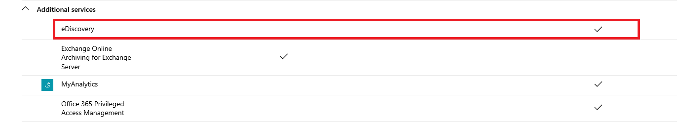 - Additional services – the last group features eDiscovery, Archiving, MyAnalytics and Privileged Access Management