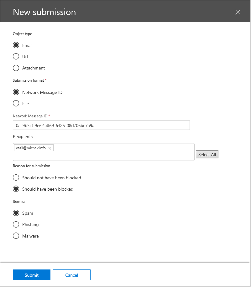 Providing the Message trace ID value from above did the trick, and after a short validation the value was accepted. Next, I had to provide a Recipient, which I was able to select from the automatically populated drop down list (nice touch!). After that, one must specify the Reason for submission, in other words whether you are reporting a false-positive or false-negative item. Lastly, select the Item type: Spam, Phishing or Malware. In my case, the submission looked like this: