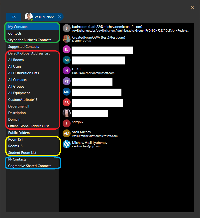 To access the new “contact picker”, start composing a new message then press the To or CC button. You will be presented with the control shown below. On the left hand side, a list of “contact lists” will be shown, which includes: personal contacts (green box); GAL, OAB and additional Address lists (red box); Room lists (yellow box); Public folder contacts (blue box):