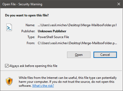 So most of you are probably familiar with the Attachment Manager feature in Windows, which “stamps” files downloaded from the internet and works together with the SmartScreen feature to protect you from opening them accidentally. I wont go into much details on how it all works together, but for our purposes I will mention the generic steps of the process: you download a file (say .reg or .ps1 from the internet), some metadata is added to the file’s Alternate Data Stream, and when you try to open it Windows will display a window such as the below: