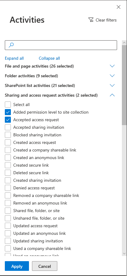 In addition, selecting all event types for a specific workload by clicking the corresponding “workload name” entry is no longer possible from the dropdown. For such operations, you can rely on a newly introduced pane, surfaced by clicking the “View all activities” link. There, you can click the “Select all” entry under each group to include all events from a given workload, or search for/select individual entries as needed. The number of selected entries is shown next to each section, but you don’t get to see the total count, and yes, limitations still apply here. You can also use the “Expand all”/”Collapse all” toggles to quickly navigate the list of entries.
