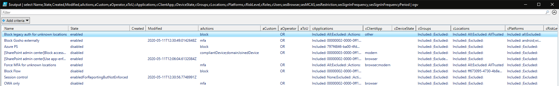 Some additional transformation of the output might be needed to get a meaningful report, featuring the different conditions and controls. Things like the name of the policy and its status are a non-brainer, but when it comes to the full list of conditions and actions supported, the output can be a bit ugly. The format I’ve chosen adds some readability and looks something like the below: