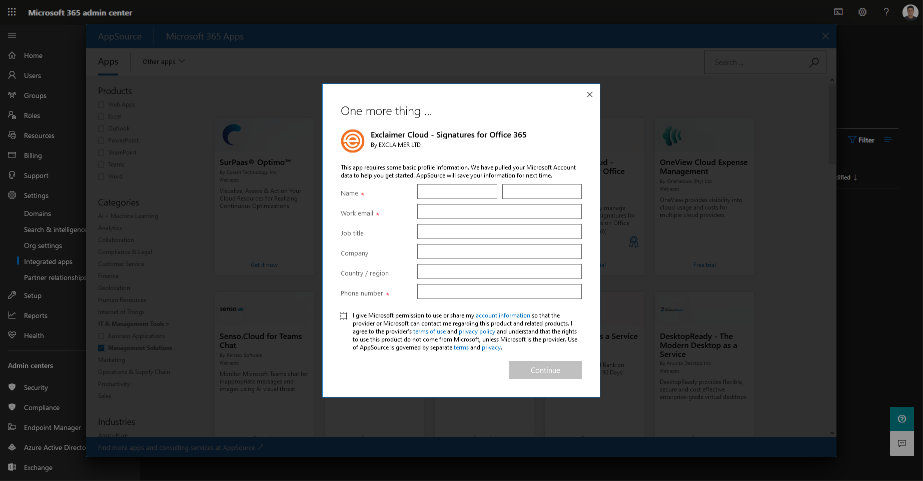 As customary for each new release, the experience has some rough edges, such as being unable to populate your details once you select a given app. Unlike the standalone AppSource portal, which happily recognizes my Office 365 profile and fills in all the relevant data automatically, the Microsoft 365 Admin Center experience results in a blank dialog, as shown below:
