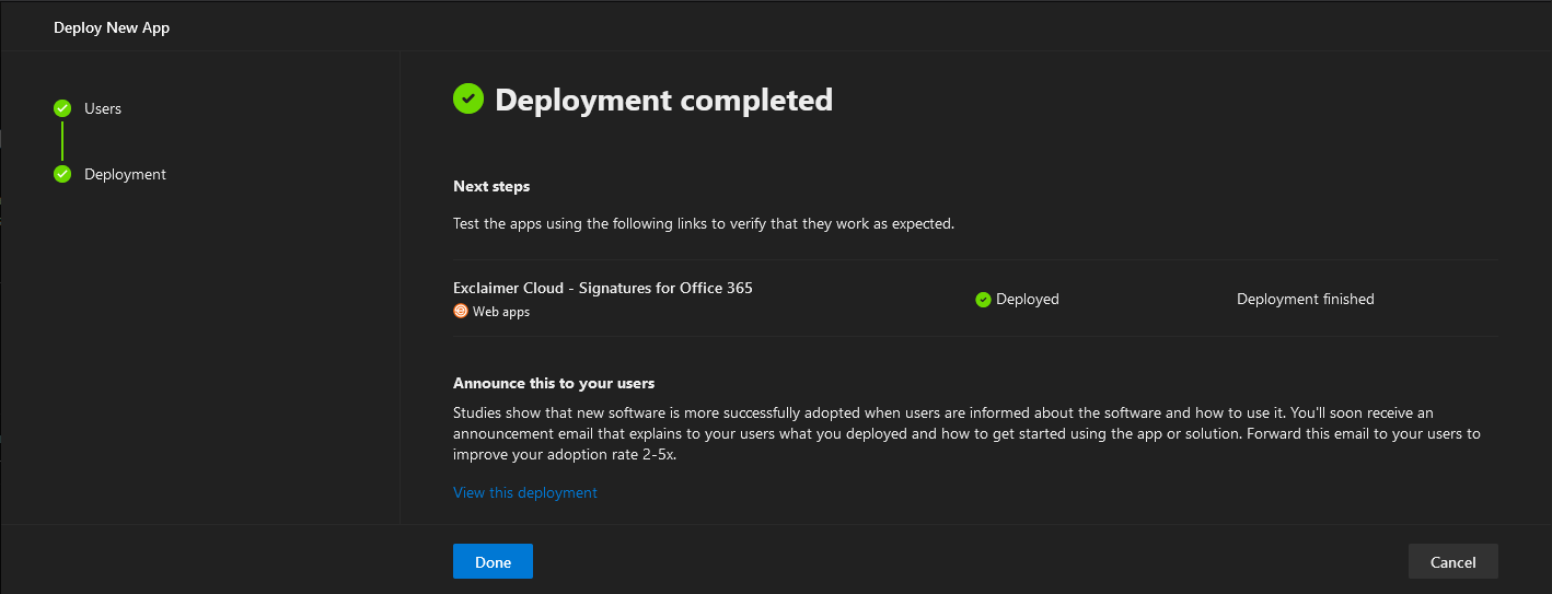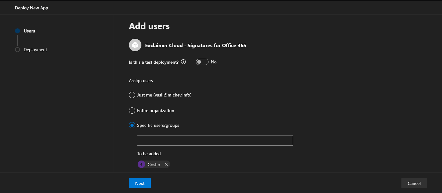 This part of the experience is optional though, and in some cases you will only be presented with the checkbox/continue prompt. Once you have selected an app and filled in those details or pressed the Continue button, the Deploy New App wizard will launch. For some applications, an initial Configuration page will be made available, while others will take you directly to the Users page. Here, you can specify whether this is a test deployment or not, and decide who to deploy the application to. The choices here are Just me, the Entire organization or Specific users/groups. For the latter, you can select any distribution, security or Office 365 Group. The test deployment toggle has no effect of the user selection process.
