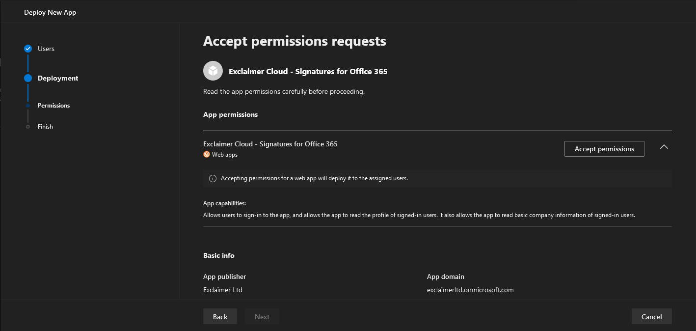 Pressing the Next button takes you to the Deployment part of the wizard, where you will need to provide consent for the app, under the Permissions page depicted below. Few useful improvements can be made to this page, such as including an actual link in the “Read the app permissions carefully before proceeding.” warning text, surfacing additional details about the application and its publisher, and most importantly replacing the App capabilities section with more structured representation of the set of permissions required by the app.