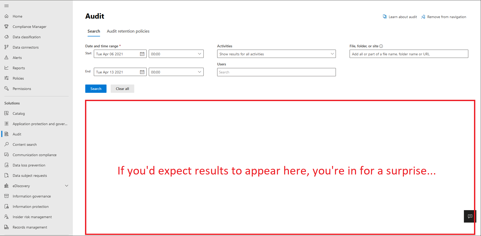 Oh, but it gets even better. Once you end up on the results page, you cannot view or modify the search query anymore. Because that’s how searches against the Unified Audit log work, right? You enter the exact set of criteria on your first try and never look back. In the minds of some dev or PM that is, definitely not in the mind of anyone that actually uses this functionality. Of course, getting back to the Audit page resets the UI controls. And god forbids Microsoft listens to feedback and adds the saved searches/templates functionality here! At least you can now copy/paste a query’s URL and do that yourself…