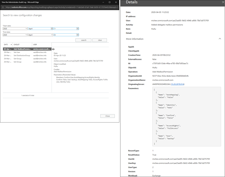 Switching gears a bit, you will be delighted to know that the running the cmdlets via this new method still results in them being diligently captured in the Admin audit log, which in turn flows into the Unified Audit log in Office 365. This is illustrated on the screenshot below, where the left side represents the event captured in Exchange’s admin audit log, and the right side gives you the details of the same event as seen in the Unified audit log: