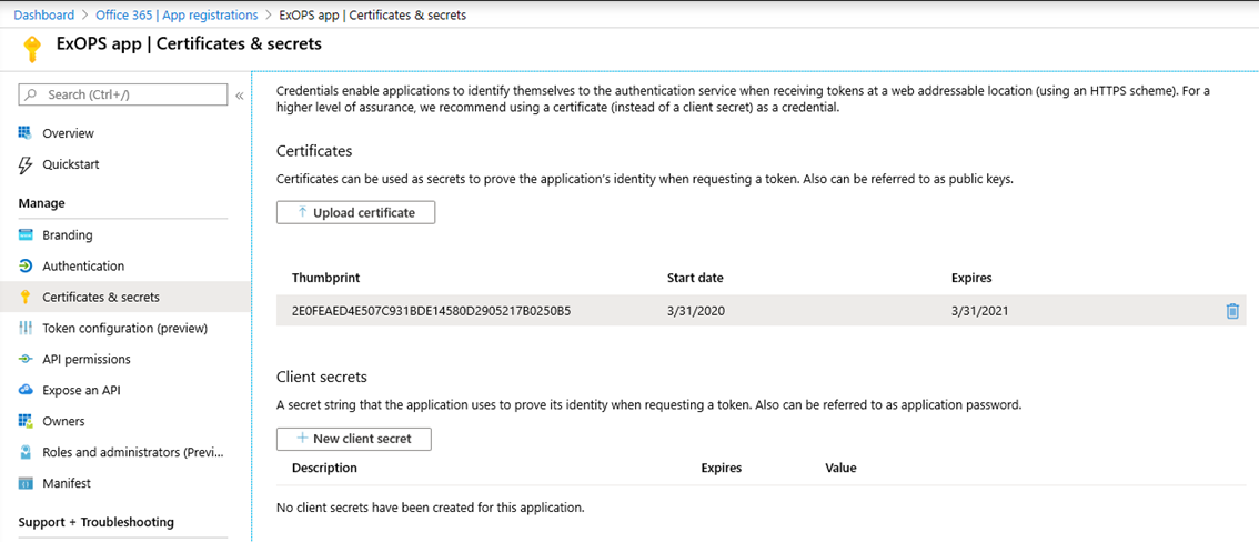 So far, we have created an application object and granted it certain permissions in our directory. In order to be able to use said application however, we need to authenticate against Azure AD and obtain a token for it. When using the “application permissions” model, this is performed via client secret or a certificate. The former is basically a very long password string and is generally considered less secure than using a certificate. With that in mind, Microsoft has chosen to only support certificate authentication for establishing a new remote PowerShell session.