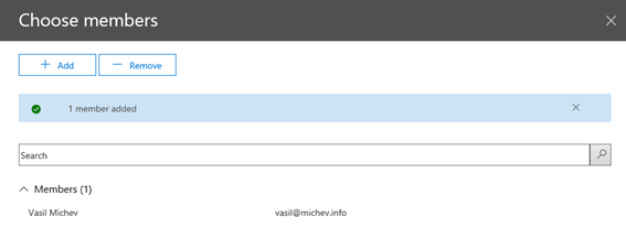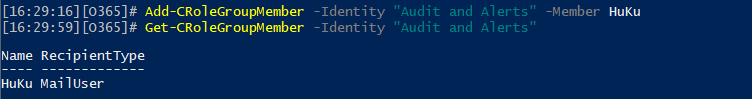 As we didn’t specify any members for the role group when creating it, we can now add them via the Add-CRoleGroupMember cmdlet and then check the membership via Get-CRoleGroupMember:
