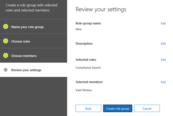 Lastly, you will be presented with the Review page, where you can perform last checkup before creating the new role group. If everything is in order, press the Create role group button.