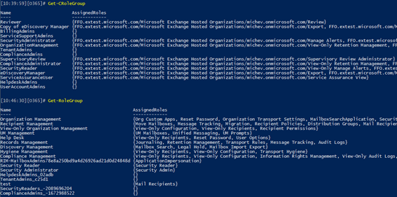 We can start by viewing the list of roles and role group and compare it to the ones Exchange Online. For example, the picture below compares the set of role groups in the SCC (top half) and the role groups in ExO (lower half):