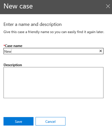 The eDiscovery cases UI has also been revamped with the new look and feel, so all the points discussed in the above sections apply. So does the general principle on the new UI – using the panes instead of popup windows. Thus, when you press the Create a case button to create a new eDiscovery case, the following pane will appear instead of a popup:
