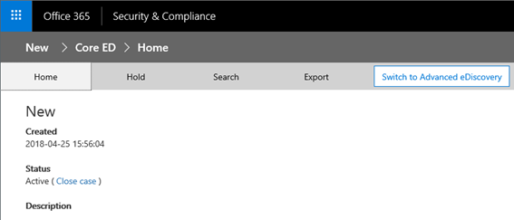 Any configuration related to putting content on hold, performing searches or exporting data is done in the “Core ED” UI, which looks very similar to the Content Searches UI we discussed in the previous sections. To access it, select a case and press the Open button next to its name. The “Core ED” UI has four tabs, as depicted on the screenshot below: