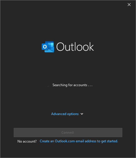 You will then be presented with the (not so) new Add account dialog, which will try to help you with the process. It would be nice if there was a mechanism that would list all the shared mailboxes you have access to at this point, however this is not yet the case, so just wait for the “searching for accounts” phase to end: