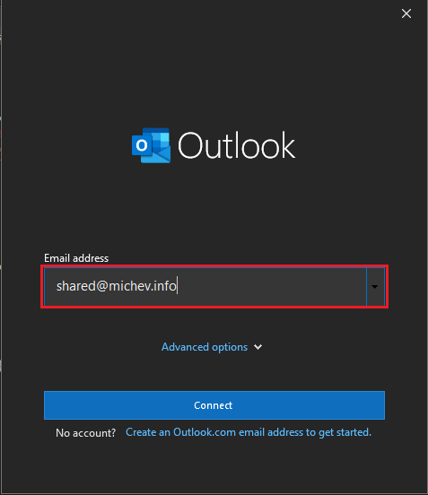 Once you have entered the address of the shared mailbox, press the Connect button. Outlook will issue an autodiscover request and once it validates the address, it will present you with a credentials prompt. It’s the year 2022, so you should something similar to the below. If the prompt looks differently, you are likely using an outdated version of Office and/or Windows. Refer to the links at the end of the article for detailed steps in such scenarios.