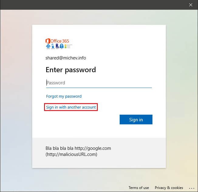 Now, this is the most important part of the process. As you can note from the screenshot below, the credentials we are being asked to provide are for the shared mailbox account. This is not what we should do. Instead, press the Sign in with another account link, as highlighted below:
