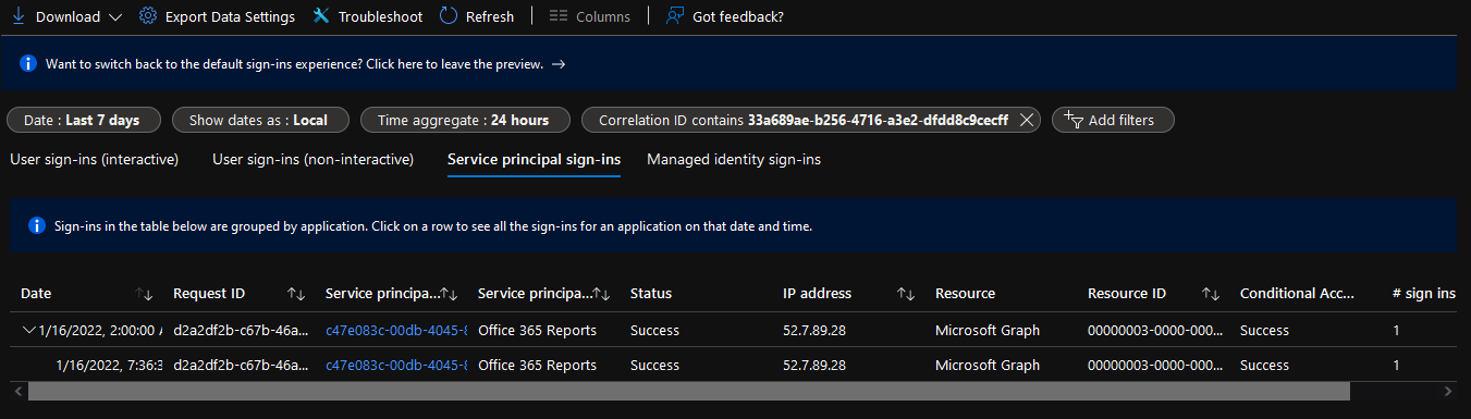 Don’t forget that entries in the Azure AD blade UI are aggregated together, so you might need to adjust the aggregation window (shouldn’t matter when filtering for specific correlationId though).