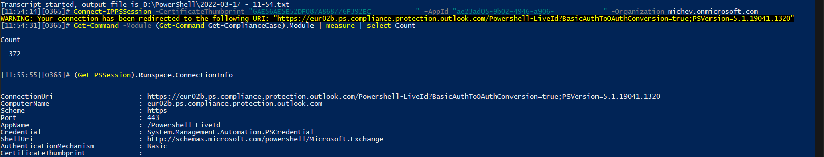 With the most permissive role assigned, a total of 372 cmdlets are exposed when connecting via CBA. This is in fact a significant increase over the 328 cmdlets exposed when connecting via other methods, and at this point it’s not clear as to why some of those cmdlets are not available when connecting in a user context. Examples include: Cancel-DlpEdmSession, Create-FilePlanFirstRunLabels, Enable-ComplianceFeature, Start-DlpSensitiveInformationScan and more. Likely some RBAC magic is happening here, but it’s hard to tell due to the limited set of RBAC cmdlets supported for the SCC endpoint.