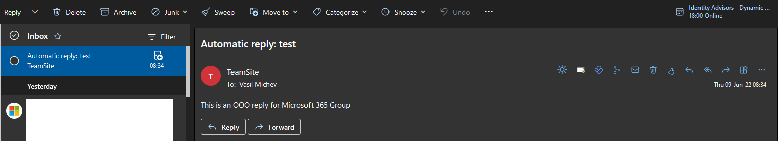 Interestingly, no MailTip is presented when an OOO message is configured for a Microsoft 365 Group, in contrast with the mailbox experience. But hey, you cannot have it all!