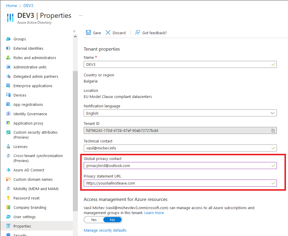 What the UI doesn’t tell you though is that in order to toggle the setting Off, you need to have configured the Privacy-related information, mentioned above. To do this, open the organization’s profile under the Azure AD blade > Properties and make sure to fill in both the Global privacy contact and Privacy statement URL fields. There’s no requirements as to what values you can enter, so you can for example use an outlook.com address.