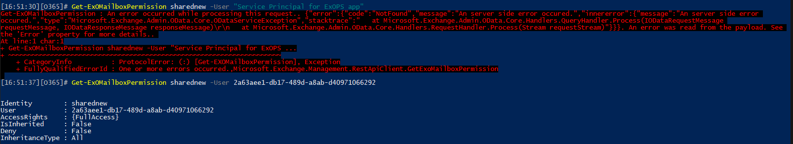 Now that we’ve covered Full access permissions, the question remains is there any other permission types for which service principal objects are supported? Turns out, you can actually grant Send As permissions as well, by leveraging the Add-RecipientPermission cmdlet and providing the service principal identifier as input for the -User parameter: