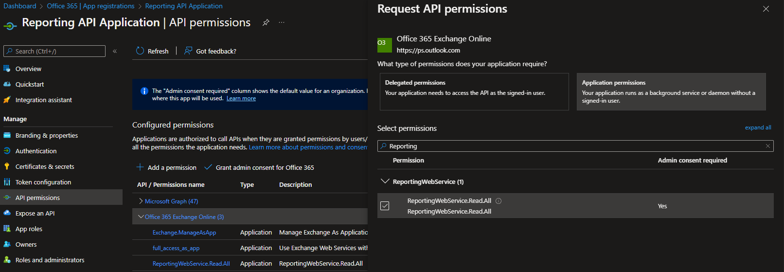 First, we need an Azure AD app registration. Any existing one would do, but you can provision a new app if needed. Make sure to configure the relevant platform and authentication settings as needed, detailed instructions can be found for example here. As the Reporting web service supports both the delegate and application permission models, you are free to configure anything you want at this point. Speaking of permissions, the required entry, ReportingWebService.Read for delegate permissions or ReportingWebService.Read.All for application ones, can only be found under the Office 365 Exchange Online resource. As Microsoft has since hidden the relevant entry under the Request API permissions pane, you will have to follow the instructions from this article to get to it.