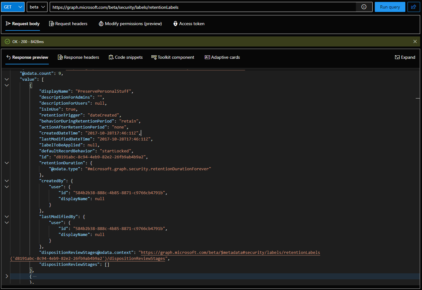 Once permissions are taken care of, all you need to do is authenticate and start using the new endpoints. The Graph Explorer tool is a good starting point when running in the delegate permissions model, so here’s how a request to list all retention labels within the tenant looks like therein: